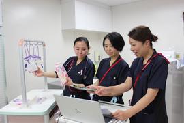 外来において専門的な治療を受ける患者さんが増えています。その中でもインスリン調整指導、糖尿病透析予防指導、フットケア、ストーマケア、リンパ浮腫ケア、緩和ケア(疼痛マネジメントや放射線療法のケア)等では専門的知識を持った看護師が中心となって運営しています。また、在宅支援が必要な患者に対しては地域医療連携室、がん相談支援センター、認知症疾患医療センターのスタッフと連携しながらチーム全体で対応しています。救急外来、内視鏡室、放射線検査・治療においては、迅速で安全な介助ができるよう各自が自己研鑽に努め、高度な救命処置の提供を目指しています。
